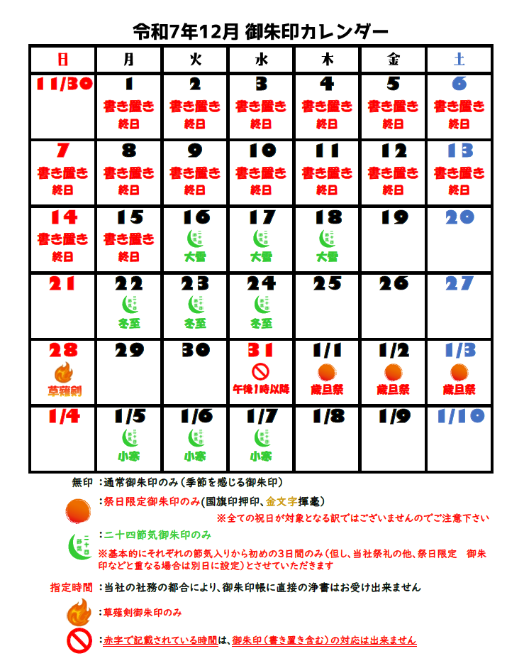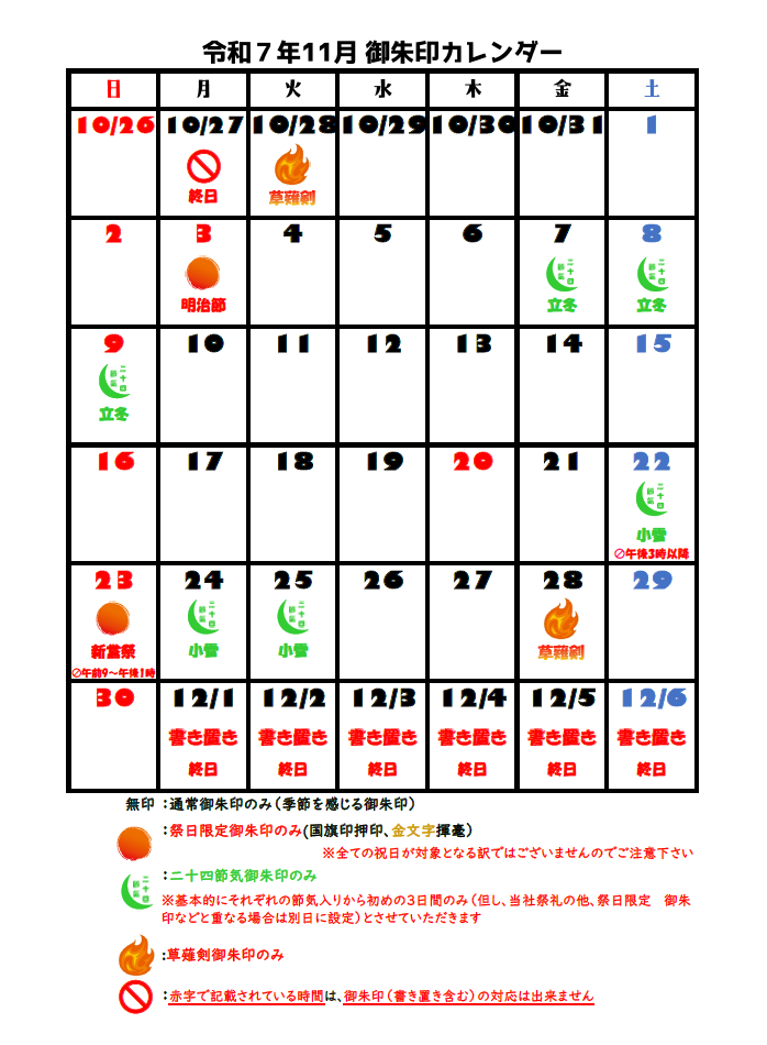 ※カレンダー中の “ 祭日限定御朱印 ” の一覧はこちらをご覧下さい。